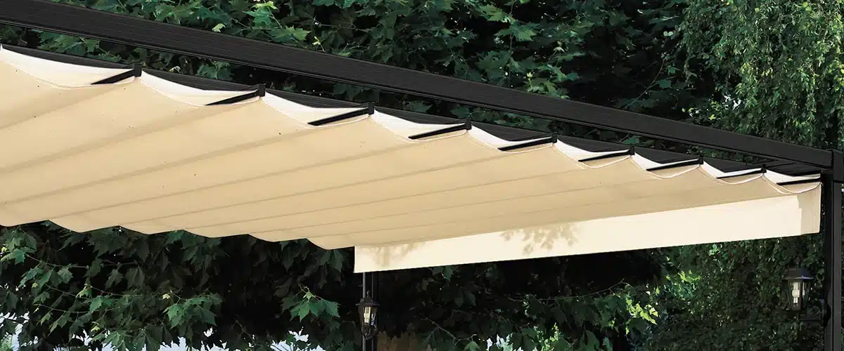 Nuestra pérgola de exterior consiste en un techo retráctil formado por tramos de tela que cuelgan entre perfiles de aluminio a los cuales llamamos jaretones, y forman una serie de ondas.